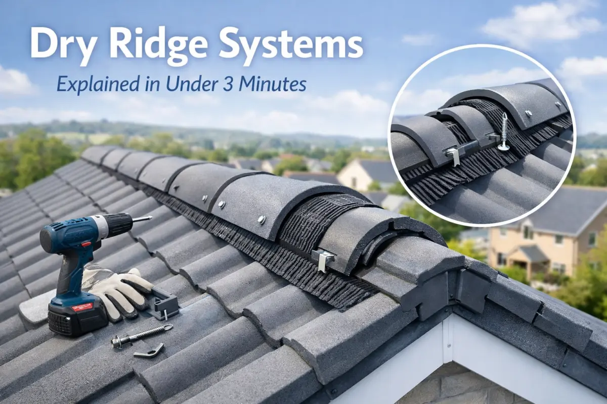 A dry ridge system is a modern roofing solution that secures ridge tiles at the peak of your roof using mechanical fixings instead of traditional mortar. Instead of cement bedding that cracks and fails over time, this system uses screws, clips, and brackets to hold everything firmly in place.